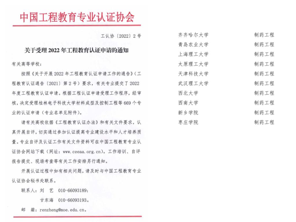 1月27日,中国工程教育专业认证协会公布了《关于受理2022年工程教育认证申请的通知》(工认协〔2022〕2号),英国上市公司官网365制药工程专业认证申请喜获中国工程教育专业认证协会受理,实现了英国上市公司官网365工程教育认证的突破。