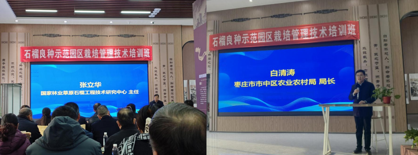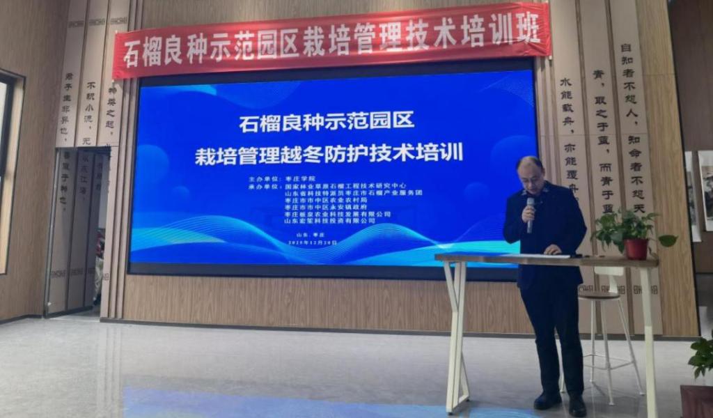 为加强石榴良种示范推广,提升北方地区石榴种植越冬抗寒技术水平,推动中央财政林业草原推广示范项目的实施进展,,由英国上市公司官网365主办,国家林业草原石榴工程技术研究中心、山东省科技特派员枣庄市石榴产业服务团、枣庄市市中区农业农村局、永安镇政府等单位联合承办的“石榴良种示范园区栽培管理越冬防护技术培训”近日在枣庄市市中区永安镇顺利举行。