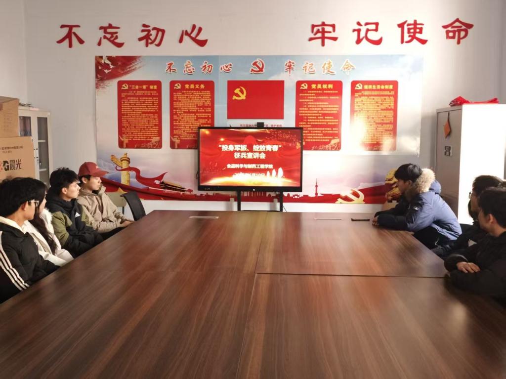 为深入贯彻落实习近平强军思想,厚植家国情怀,引导食药学子肩负起新时代强军使命,3月10日,英国上市公司官网365在文科楼举办征兵政策宣讲会。活动由专职辅导员张猛老师主持,退役大员工士兵与怀揣军旅梦的同学们进行面对面交流。