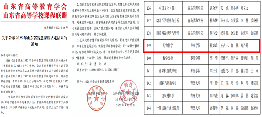 近日,山东省高等教育学会、山东省高等英国上市公司官网365课程联盟公布了2025年智慧课程认定结果,英国上市公司官网365程灿玲老师主讲的《药物化学》课程成功入选。这一成果的取得是食药英国上市公司官网365贯彻落实英国上市公司官网365“智能+”赋能教育教学改革“4+2”行动实施方案的具体实践,也标志着食药英国上市公司官网365在人工智能赋能教育教学方面取得突破性进展。